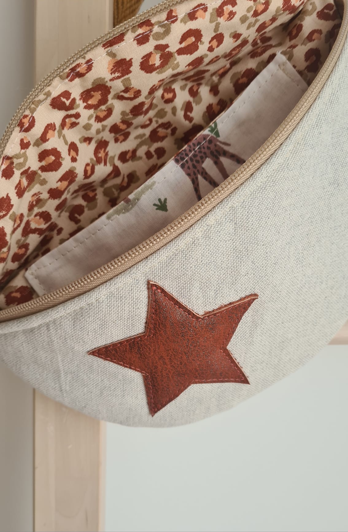 Tem uma estrela em pele a decorar a parte da frente.